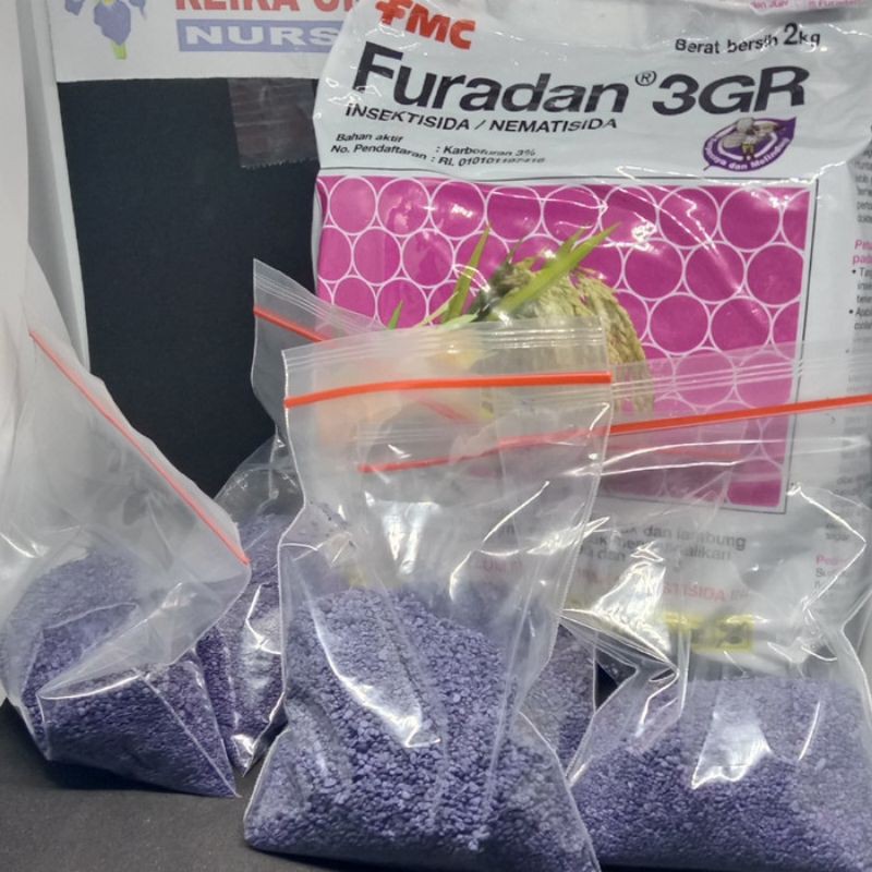 FURADAN 3GR Merupakan Insektisida / Nematisida sistemik, berbentuk butiran berwarna ungu ditujukan untuk membunuh serangga dalam bentuk larva seperti hama Penggerek batang, Uret, nematoda bintil akar, dan ulat grayak pada tanaman padi sawah, padi gogo, Kentang, tomat, kapas, cabai, tembakau, cengkeh, jeruk, lada, teh, dan tebu.Dosis pemakaian Furadan 3GR berkisar untuk kebanyakan larva adalah diantara 5 - 10 gr/m2, tetapi untuk larva yang lebih besar seperti larva penggerek batang diperlukan dosis sampai 100gr/tanaman yang diberikan di sekitar perakaran ta