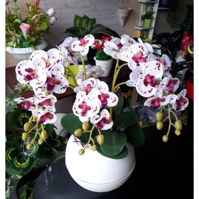 anggrek tutul bahan kainharga sudah termasuk pot bola sesuai pict pakai 4buket anggrek (8juntai)diameter pot 18cmtinggi pot 15cmtinggi keseluruhan -